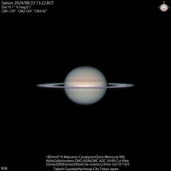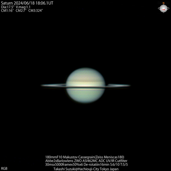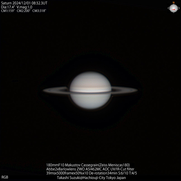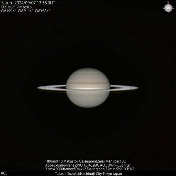 2024年の土星は衝は9月9日、みずがめ座にあって久しぶりに高度の高い位置で見ることができた。環の消失を来年にひかえ環の傾きが小さな姿が見られた。